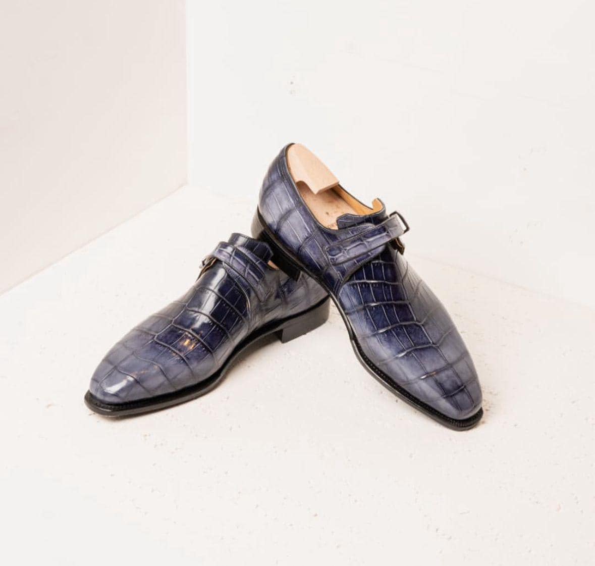 Smoked Gray Crocodile Pattern Patina Single Monkstrap Goodyear Welted Handmade Shoes – Italian Style
